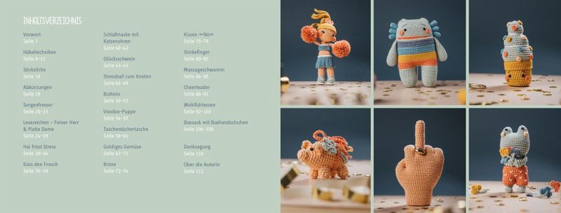 Stress bei der Arbeit, im Haushalt, mit der Familie oder einfach mit sich selbst? Es gibt Tage, da will man alles hinschmeißen. Und wenn alles zu viel wird, dann muss schnell eine Lösung her, die hilft, endlich loszulassen und all die Wut rauszulassen. Und was könnte besser helfen, als eine Runde zu häkeln?! Denn wenn der Geduldsfaden reißt, häkle dir was Schönes draus! Diese 20 witzigen Häkelmodelle von der Voodoopuppe bis hin zum Sorgenfresser leisten gute Dienste an diesen stressigen Tagen. Sie befriedigen akutes Rachebedürfnis, fördern die Selbstliebe, helfen, einen anderen Fokus zu finden, richtig runterzukommen, und bringen jede_n zum Lachen. Jede Anleitung kommt mit kleinen - mehr oder weniger ernst gemeinten - Tipps, die dabei unterstützen, den Stress schneller loszuwerden. Alle Modelle sind auch für Anfänger_innen leicht zu häkeln und schnell umzusetzen.