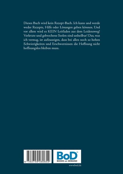 Dieses Buch wird kein Rezept-Buch. Ich kann und werde weder Rezepte, Hilfe oder Lösungen geben können. Und vor allem wird es KEIN Leitfaden aus dem Leidensweg! Verletzte und gebrochene Seelen sind unheilbar! Das, was ich vermag, ist aufzuzeigen, dass bei allen noch so hohen Schwierigkeiten und Erschwernissen die Hoffnung nicht hoffnungslos bleiben muss.