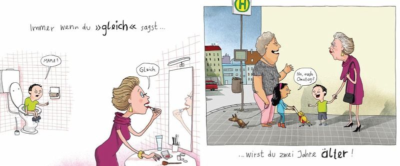 Da wartet das Kind auf dem Klo und Mama zieht sich die Lippen nach und sagt „Gleich“. Auf dem nächsten Bild wird sie als Folge zwei Jahre älter,