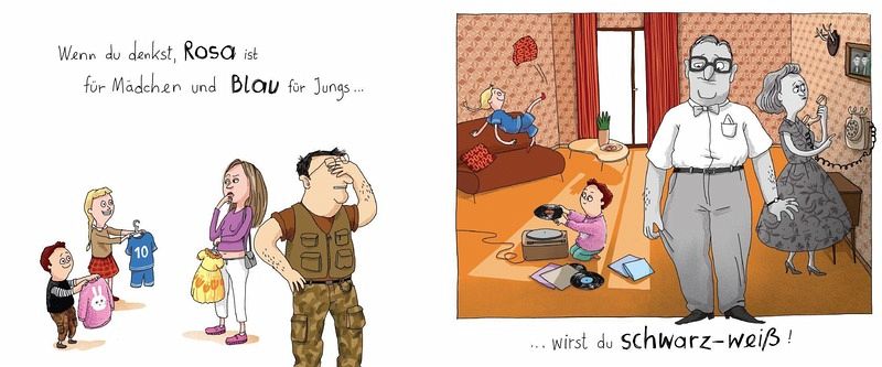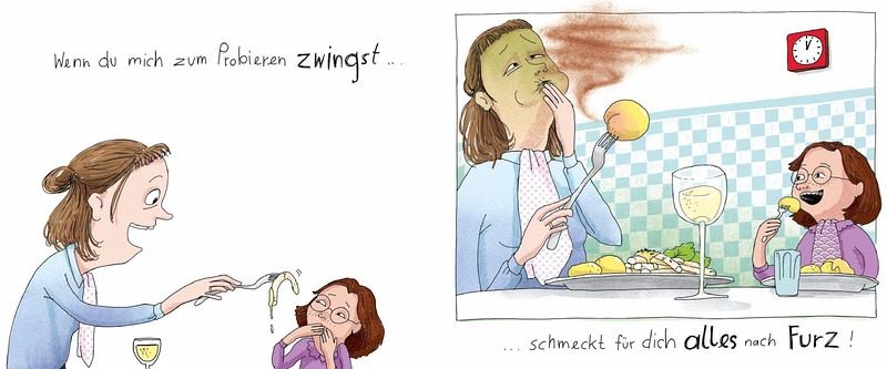 Die Eltern glotzen aufs Handy und bekommen rechteckige Augen. Die Drohung kenne ich noch vom Fernsehgucken. Für Jungen und Mädchen nur blau und rosa, da wirst du schwarz-weiß. Wenn die Kinder zum Probieren gezwungen werden, schmeckt der Mutter „alles nach Furz!“ Aber am Ende des Buches erfährt man auch, wie man „die besten Eltern der Welt“ wird.