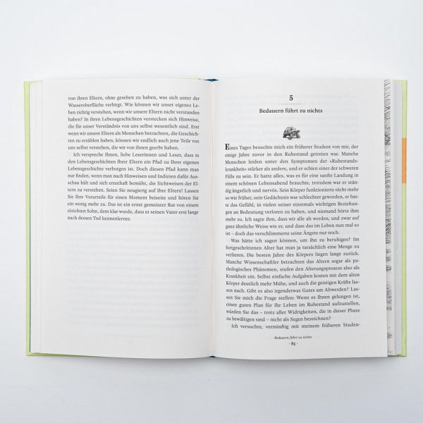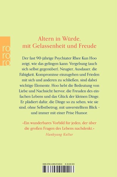 Vergebung (auch sich selbst gegenüber), Ausdauer, die Fähigkeit, Kompromisse einzugehen und Frieden mit sich und anderen zu schließen, sind dabei wichtige Elemente. Hoo hebt die Bedeutung von Liebe und Nachsicht hervor, die Freuden des einfachen Lebens und das Glück der kleinen Dinge. Er plädiert dafür, die Dinge so zu sehen, wie sie sind, ohne Selbstbetrug, mit unverstelltem Blick - und immer mit einer Prise Humor. Obwohl es nicht immer einfach ist, kann es gelingen, das Altern anzunehmen, neugierig zu bleiben, sich dem lebenslangen Lernen zu verschreiben und dabei nie zu vergessen, das Gute im Blick zu behalten. Hoo zeigt, wie.