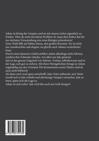 Adam ist König der Vampire und ist mit seinem Leben eigentlich zufrieden. Wäre da nicht das kleine Problem: Er muss dem hohen Rat bis zur nächsten Versammlung eine neue Königin präsentieren!Seine Wahl fällt auf Sabina Sirena, den großen Kinostar- Sie ist nicht nur wunderschön und elegant, sie gleicht auch Adams verstorbener Frau!Durch einen dummen Zufall entführt Adam allerdings nicht Sabrina, sondern ihre Schwester Juleska, von allen nur Jule genannt.Jule ist das genaue Gegenteil von Sabrina. Vorlaut, selbstbewusst und in der Lage, sich gut zu wehren. Mit ihren Wortgefechten bringt sie Adam regelmäßig um den Verstand. Die Kommentare seiner Mutter sind da auch nicht hilfreich!Als dann auch noch ganz unverhofft, Jules Vater auftaucht, sein Vetter Gerolf sich in Jule verliebt und abtrünnige Vampire versuchen, Jule zu töten, spitzt sich die Lage zu.Adam ist sich sicher: Jule wird ihn noch ins Grab bringen!