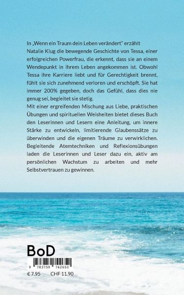 In "Wenn ein Traum dein Leben verändert" erzählt Natalie Klug die bewegende Geschichte von Tessa, einer erfolgreichen Powerfrau, die erkennt, dass sie an einem Wendepunkt in ihrem Leben angekommen ist. Obwohl Tessa ihre Karriere liebt und für Gerechtigkeit brennt, fühlt sie sich zunehmend verloren und erschöpft. Sie hat immer 200 % gegeben, doch das Gefühl, dass dies nie genug sei, begleitet sie stetig. Eines Tages trifft sie auf einen mysteriösen alten Mann und eine lebenslustige ältere Lady, die ihr unerwartet den Weg aus ihrer inneren Krise zeigen. Durch tiefsinnige Gespräche und Begegnungen erfährt Tessa, dass wahre Erfüllung nicht nur im äußeren Erfolg liegt, sondern tief in ihr selbst. Sie begibt sich auf eine Reise der Selbstfindung und lernt, alte Glaubenssätze loszulassen, entdeckt ihren inneren Kompass wieder und beschreitet einen völlig neuen Weg. Unterstützt durch einfache Übungen für den Alltag, lernt sie, sich von negativen Gedankenmustern zu befreien und den Raum für Selbstverwirklichung zu öffnen. Mit einer ergreifenden Mischung aus Liebe, spirituellen Weisheiten und praktischen Übungen bietet "Wenn ein Traum dein Leben verändert" den Leserinnen und Lesern eine Anleitung, um innere Stärke zu entwickeln, limitierende Glaubenssätze zu überwinden und die eigenen Träume zu verwirklichen. Begleitende Atemtechniken und Reflexionsübungen laden die Leserinnen und Leser dazu ein, aktiv am persönlichen Wachstum zu arbeiten und mehr Selbstvertrauen und Selbstbewusstsein zu gewinnen.