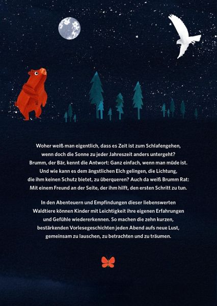 Einschlafen mit Bär, Elch, Eule und vielen anderen Waldbewohnern: Gutenachtgeschichten zum Mitfühlen, Runterkommen und TräumenWoher weiß man eigentlich, dass es Zeit ist zum Schlafengehen, wenn doch die Sonne zu jeder Jahreszeit anders untergeht? Brumm, der Bär, kennt die Antwort: ganz einfach, wenn man müde ist. Und wie kann es dem ängstlichen Elch gelingen, die Lichtung, die ihm keinen Schutz bietet, zu überqueren? Auch da weiß Brumm Rat: mit einem Freund an der Seite, der hilft, den ersten Schritt zu tun. In zehn kurzen, atmosphärischen Vorlesegeschichten begegnen den Kindern die verschiedensten Waldtiere, die unaufgeregte Abenteuer erleben, ganz nah dran an der Gefühlswelt und den Alltagserlebnissen der Kleinen. Üppig bebildert, laden sie zum gemeinsamen Lauschen, Betrachten und Träumen ein.