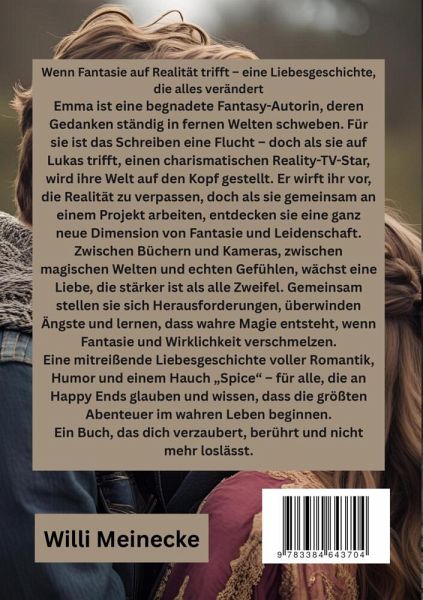 Wenn Fantasie auf Realität trifft - eine Liebesgeschichte, die alles verändertEmma ist eine begnadete Fantasy-Autorin, deren Gedanken ständig in fernen Welten schweben. Für sie ist das Schreiben eine Flucht - doch als sie auf Lukas trifft, einen charismatischen Reality-TV-Star, wird ihre Welt auf den Kopf gestellt. Er wirft ihr vor, die Realität zu verpassen, doch als sie gemeinsam an einem Projekt arbeiten, entdecken sie eine ganz neue Dimension von Fantasie und Leidenschaft.Zwischen Büchern und Kameras, zwischen magischen Welten und echten Gefühlen, wächst eine Liebe, die stärker ist als alle Zweifel. Gemeinsam stellen sie sich Herausforderungen, überwinden Ängste und lernen, dass wahre Magie entsteht, wenn Fantasie und Wirklichkeit verschmelzen.Eine mitreißende Liebesgeschichte voller Romantik, Humor und einem Hauch "Spice" - für alle, die an Happy Ends glauben und wissen, dass die größten Abenteuer im wahren Leben beginnen.Ein Buch, das dich verzaubert, berührt und nicht mehrloslässt.