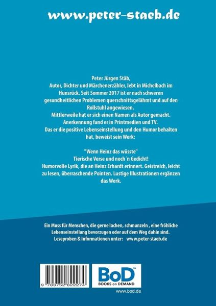 "Wenn Heinz das wüsste" Tierische Verse und noch´n Gedicht!Humorvolle Lyrik, die an Heinz Erhardt erinnern.Geistreich, leicht zu lesen, mit überraschenden Pointen.Lustige Illustrationen ergänzen das Werk.Leseproben und weitere Informationen finden Sie auf der Homepage des Autorswww.peter-staeb.de