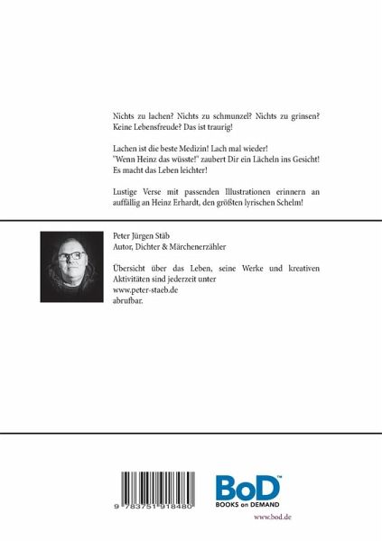 Nichts zu lachen? Nichts zu schmunzel? Nichts zu grinsen? Keine Lebensfreude? Das ist traurig!Lachen ist die beste Medizin! Lach mal wieder! "Wenn Heinz das wüsste!" zaubert Dir ein Lächeln ins Gesicht! Es macht das Leben leichter!Lustige Verse mit passenden Illustrationen erinnern an mein großes Vorbild Heinz Erhardt, wohl wissend, dass ich nicht ganz an dessen Genialität herankomme - aber ich bemühe mich!"Wenn Heinz das wüsste"Tierische Verse und noch´n Gedicht!Humorvolle Lyrik, geistreich, leicht zu lesen, mit überraschenden Pointen. Lustige Illustrationen ergänzen das Werk.www.peter-staeb.de
