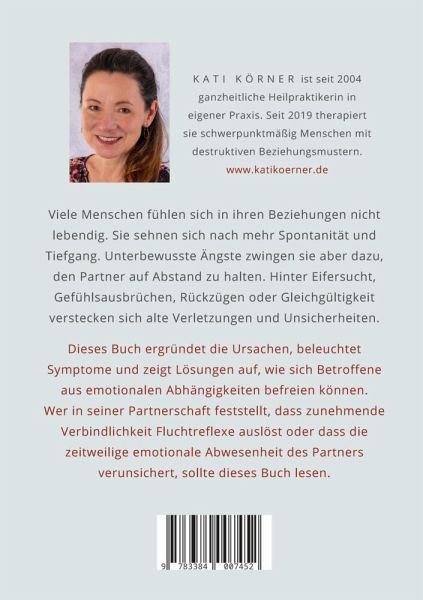 Wie du emotionale Abhängigkeiten lösen und eine glückliche Beziehung führen lernstKämpfst du bei deiner Partnerin oder deinem Partner oft mit einem Nähe-Distanz-Problem? Reagierst du auf kleinste Probleme mit heftigen Gefühlsausbrüchen, die deine Beziehung belasten? Verursacht schon eine kurze Abwesenheit Stress und Eifersucht?Die ganzheitliche Heilpraktikerin Kati Körner zeigt dir in diesem Buch die Gründe und Ursachen für ungesunde Bindungsmuster auf. Sie gibt dir wertvolle Tipps, wie du dich von alten Schutzmechanismen befreien kannst und hilft dir, verborgene Facetten deiner Persönlichkeit zu entdecken.- Wie du unsichere Bindungsstile und Beziehungsstrategien erkennst- Toxische Beziehungen: Angst vor Intimität und ihre Ursachen in der Kindheit- Bindungs- und Verlustängste überwinden: Anregungen und Erfahrungen- Der Ratgeber zur Psychologie von co-abhängigen Beziehungen und narzisstischen Verhaltensmustern- Der Blick nach vorne: Wie du deine Zukunft ohne negative Einflüsse ausder Vergangenheit gestalten kannstBindungstrauma überwinden und sich selbst verstehenWas in schwierigen Kindheitssituationen geholfen hat, kann sich im Erwachsenenleben sehr negativ auswirken. Kati Körner hat in ihrer Praxis schon vielen Menschen dabei geholfen, alte Verhaltensmuster zu erkennen und durch positive zu ersetzen. Diese Auseinandersetzung mit unsicheren Bindungsstilen und toxischem Verhalten hat sie in ihrem Buch über emotionale Abhängigkeiten zusammengefasst. Lerne, dein Selbstwertgefühl zu stärken, dich von Altem zu lösen und deine Zukunft positiv zu gestalten - nicht nur in Beziehungen, sondern auch für dich selbst!