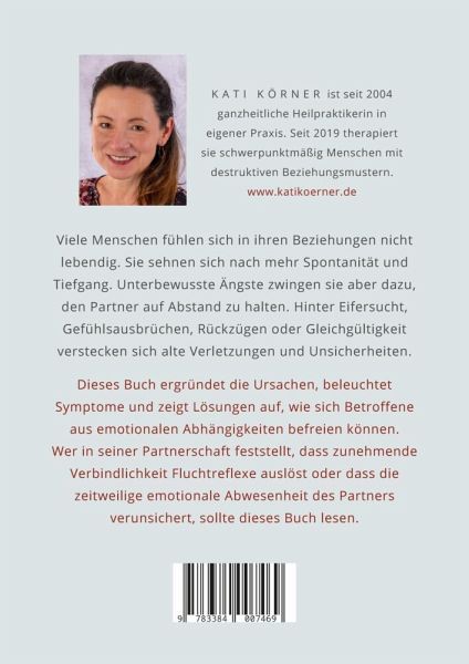 Wie du emotionale Abhängigkeiten lösen und eine glückliche Beziehung führen lernstKämpfst du bei deiner Partnerin oder deinem Partner oft mit einem Nähe-Distanz-Problem? Reagierst du auf kleinste Probleme mit heftigen Gefühlsausbrüchen, die deine Beziehung belasten? Verursacht schon eine kurze Abwesenheit Stress und Eifersucht?Die ganzheitliche Heilpraktikerin Kati Körner zeigt dir in diesem Buch die Gründe und Ursachen für ungesunde Bindungsmuster auf. Sie gibt dir wertvolle Tipps, wie du dich von alten Schutzmechanismen befreien kannst und hilft dir, verborgene Facetten deiner Persönlichkeit zu entdecken.- Wie du unsichere Bindungsstile und Beziehungsstrategien erkennst- Toxische Beziehungen: Angst vor Intimität und ihre Ursachen in der Kindheit- Bindungs- und Verlustängste überwinden: Anregungen und Erfahrungen- Der Ratgeber zur Psychologie von co-abhängigen Beziehungen und narzisstischen Verhaltensmustern- Der Blick nach vorne: Wie du deine Zukunft ohne negative Einflüsse ausder Vergangenheit gestalten kannstBindungstrauma überwinden und sich selbst verstehenWas in schwierigen Kindheitssituationen geholfen hat, kann sich im Erwachsenenleben sehr negativ auswirken. Kati Körner hat in ihrer Praxis schon vielen Menschen dabei geholfen, alte Verhaltensmuster zu erkennen und durch positive zu ersetzen. Diese Auseinandersetzung mit unsicheren Bindungsstilen und toxischem Verhalten hat sie in ihrem Buch über emotionale Abhängigkeiten zusammengefasst. Lerne, dein Selbstwertgefühl zu stärken, dich von Altem zu lösen und deine Zukunft positiv zu gestalten - nicht nur in Beziehungen, sondern auch für dich selbst!
