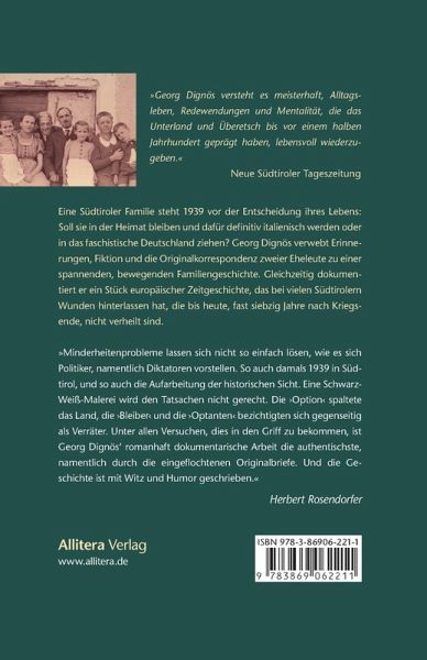 Georg Dignös verwebt Erinnerungen, Fiktion und die Originalkorrespondenz der beiden Eheleute zu einer spannenden, bewegenden Familiengeschichte. Gleichzeitig dokumentiert er ein Stück europäischer Zeitgeschichte, das bei vielen Südtirolern Wunden hinterlassen hat, die bis heute, 66 Jahre nach Kriegsende, nicht verheilt sind.