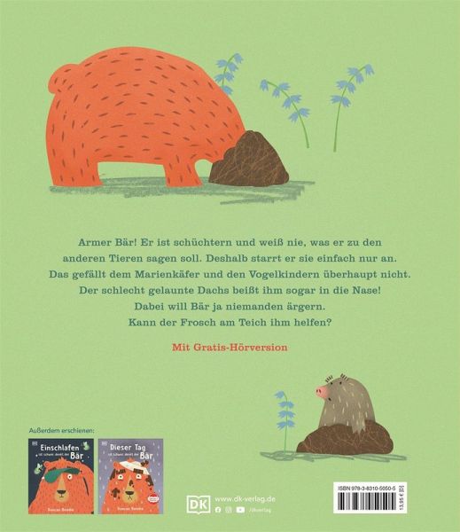 Warum guckst du so? Das wird der Bär oft gefragt. Er schaut die anderen Tiere einfach nur an, weil er nicht weiß, was er zu ihnen sagen soll. Aber Marienkäfer, Vogel und Dachs mögen es gar nicht, wenn man sie anstarrt. Zum Glück zeigt der Frosch dem Bär, dass es gar nicht schwer ist, jemanden anzusprechen: Ein Lächeln und ein freundliches "Hallo!" sind doch ganz einfach ... Das lustige Bilderbuch von Duncan Beedie beschreibt eine Situation, die Eltern oft von ihren eigenen Kindern kennen. Voller Wärme und Humor hilft der sympathische Bär Kindern ab 3 Jahren, ihre Schüchternheit zu überwinden. Die gratis Hörversion, die ganz einfach heruntergeladen werden kann, schult zudem spielerisch Sprachgefühl und Konzentrationsfähigkeit. Ein amüsante Geschichte zum Vorlesen, die sich auch bestens als Gute-Nacht-Geschichte eignet!