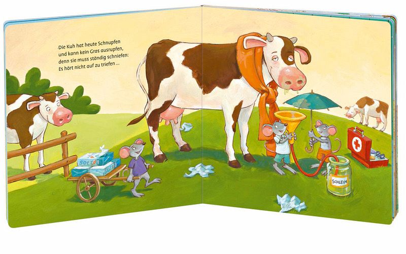 Oh je, die Tiere sind krank! Die Kuh hat Schnupfen, der Bär eine Beule und dem Schweinchen tut der Bauch weh. Doch mit der richtigen Medizin und lustigen Reimen werden alle schnell wieder gesund.