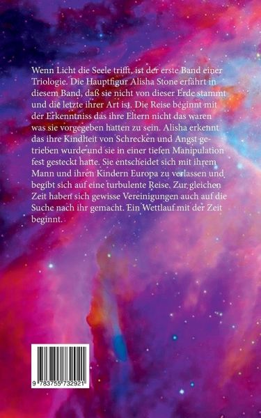 Wenn Licht die Seele trifft, ist ein neuer Fantasy Roman welcher in unserer heutigen Zeit und in der Zukunft spielt. Die Welt wird von dunklen Mächten geleitet, welche die Menschheit unterdrückt, manipuliert und benutzt. Alisha Stone steht am Anfang ihrer Reise und entdeckt ihre wahre Bestimmung. Licht ist immer stärker als Dunkelheit. Ein Wettlauf mit der Zeit beginnt.