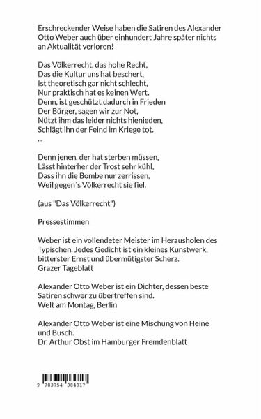 Erschreckender Weise haben die Satiren des Alexander Otto Weber auch über einhundert Jahre später nichts an Aktualität verloren!Das Völkerrecht, das hohe Recht,Das die Kultur uns hat beschert,Ist theoretisch gar nicht schlecht,Nur praktisch hat es keinen Wert.Denn, ist geschützt dadurch in FriedenDer Bürger, sagen wir zur Not,Nützt ihm das leider nichts hienieden,Schlägt ihn der Feind im Kriege tot....Denn jenen, der hat sterben müssen,Lässt hinterher der Trost sehr kühl,Dass ihn die Bombe nur zerrissen,Weil gegen´s Völkerrecht sie fiel.(aus "Das Völkerrecht")PressestimmenWeber ist ein vollendeter Meister im Herausholen des Typischen. Jedes Gedicht ist ein kleines Kunstwerk, bitterster Ernst und übermütigster Scherz.Grazer TageblattAlexander Otto Weber ist ein Dichter, dessen beste Satiren schwer zu übertreffen sind.Welt am Montag, BerlinAlexander Otto Weber ist eine Mischung von Heine und Busch.Dr. Arthur Obst im Hamburger Fremdenblatt