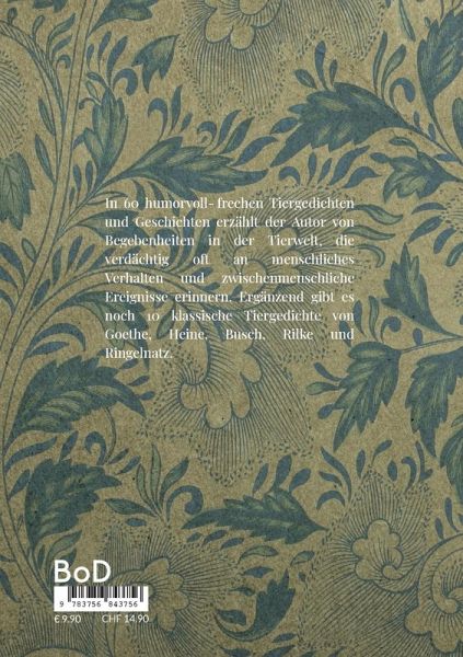 In 60 humorvoll-frechen Tiergedichten und Geschichten erzählt der Autor von Begebenheiten in der Tierwelt, die verdächtig oft an menschliches Verhalten und zwischenmenschliche Ereignisse erinnern. Ergänzend gibt es noch 15 klassische Tiergedichte von Lessing, Goethe, Heine, Busch, Morgenstern, Rilke und Ringelnatz.