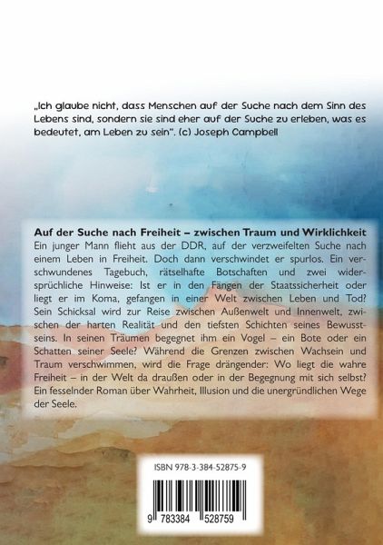 Zwischen Freiheit und Gefangenschaft - Eine Reise ins UngewisseIm Spätsommer 1988 verabschiedet sich Sebastian frühmorgens von seiner Partnerin Marlen. Gemeinsam mit seinem besten Freund Andreas fährt er nach Dresden, wo er in einer Kneipe eine Mitfahrgelegenheit nach Prag finden soll. Doch noch in derselben Nacht verschwindet er spurlos.Andreas muss die erschütternde Nachricht nach Hause bringen. Kurz darauf meldet Sebastians Mutter Monika ihn als vermisst - und stellt mit Schrecken fest, dass nicht nur ihr Sohn, sondern auch ihr Tagebuch verschwunden ist.Nach dem Fall der Mauer reist Marlen nach Ungarn, in der Hoffnung, dort eine Spur ihres Geliebten zu finden. In dieser Zeit erreicht sie eine Nachricht: Man hat Sebastian in Tschechien gefunden - neben ihm das Tagebuch seiner Mutter. Doch der junge Mann liegt im Koma.Marlen macht sich sofort auf den Weg, um seine Identität zu bestätigen.Parallel dazu erlebt Sebastian eine andere Form der Gefangenschaft: In einem DDR-Gefängnis wird er brutal festgehalten. Die Szenen seiner Haft werfen einen düsteren Schatten auf sein Schicksal und lassen keinen Zweifel daran, dass ihm Unvorstellbares widerfahren ist. Während sein Körper leidet, begibt sich sein Bewusstsein auf eine Reise in eine andere Welt. Dort begegnet er einem mystischen Vogel - seiner Seele? -, der ihn in die verborgenen Geheimnisse des Lebens einweiht.Als Marlen Sebastian im Krankenhaus endlich wieder sieht, beschließt sie, eine Ausbildung zur Krankenschwester zu beginnen, um ihn während seines langen Komas zu begleiten. Über Monikas Tagebuch entwickelt sie eine geheimnisvolle Verbindung zu ihm - bis Sebastian sie eines Tages dazu auffordert, ihr eigenes Leben weiterzuleben.Nach langem Zögern folgt Marlen diesem Ruf und erfüllt den Reisetraum, den Sebastian einst für sich erdacht hatte.Drei Jahrzehnte nach seinem Verschwinden geschieht das Unfassbare: Sebastian erwacht. Doch kaum ist er bereit, die Welt neu zu entdecken, bricht die Corona-Pandemie aus - und er findet sich erneut in einem Käfig wieder.Schließlich begegnet er auf einer Parkbank einem geheimnisvollen alten Mann, mit dem er ein tiefgründiges Gespräch über das Leben führt. Dieser gibt ihm den entscheidenden Rat: Er soll sich auf die Suche nach seiner großen Liebe begeben.Wird Sebastian Marlen nach all den Jahren wiederfinden?Ein bewegender Roman über Freiheit, Liebe und Gefangenschaft, über die verborgenen Tiefen der Seele und die Zeichen, die uns das Leben sendet.