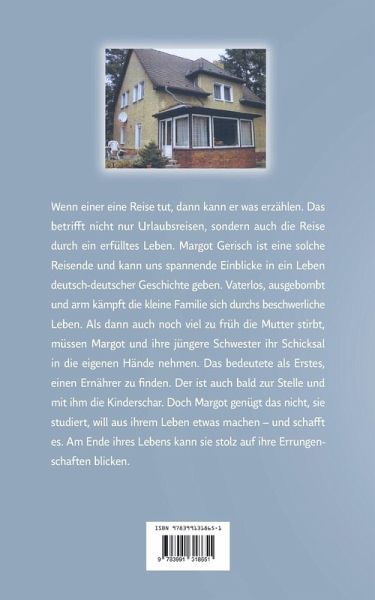 Wenn einer eine Reise tut, dann kann er was erzählen. Das betrifft nicht nur Urlaubsreisen, sondern auch die Reise durch ein erfülltes Leben. Margot Gerisch ist eine solche Reisende und kann uns spannende Einblicke in ein Leben deutsch-deutscher Geschichte geben. Vaterlos, ausgebombt und arm kämpft die kleine Familie sich durchs beschwerliche Leben. Als dann auch noch viel zu früh die Mutter stirbt, müssen Margot und ihre jüngere Schwester ihr Schicksal in die eigenen Hände nehmen. Das bedeutete als Erstes, einen Ernährer zu finden. Der ist auch bald zur Stelle und mit ihm die Kinderschar. Doch Margot genügt das nicht, sie studiert, will aus ihrem Leben etwas machen - und schafft es. Am Ende ihres Lebens kann sie stolz auf ihre Errungenschaften blicken.