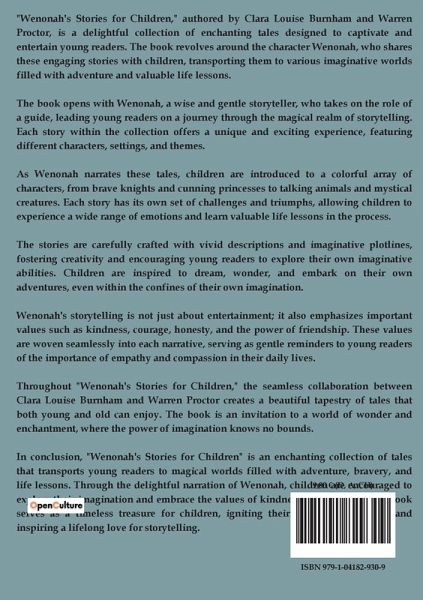 "Wenonah's Stories for Children," authored by Clara Louise Burnham and Warren Proctor, is a delightful collection of enchanting tales designed to captivate and entertain young readers. The book revolves around the character Wenonah, who shares these engaging stories with children, transporting them to various imaginative worlds filled with adventure and valuable life lessons. The book opens with Wenonah, a wise and gentle storyteller, who takes on the role of a guide, leading young readers on a journey through the magical realm of storytelling. Each story within the collection offers a unique and exciting experience, featuring different characters, settings, and themes. As Wenonah narrates these tales, children are introduced to a colorful array of characters, from brave knights and cunning princesses to talking animals and mystical creatures. Each story has its own set of challenges and triumphs, allowing children to experience a wide range of emotions and learn valuable life lessons in the process. The stories are carefully crafted with vivid descriptions and imaginative plotlines, fostering creativity and encouraging young readers to explore their own imaginative abilities. Children are inspired to dream, wonder, and embark on their own adventures, even within the confines of their own imagination. Wenonah's storytelling is not just about entertainment; it also emphasizes important values such as kindness, courage, honesty, and the power of friendship. These values are woven seamlessly into each narrative, serving as gentle reminders to young readers of the importance of empathy and compassion in their daily lives. Throughout "Wenonah's Stories for Children," the seamless collaboration between Clara Louise Burnham and Warren Proctor creates a beautiful tapestry of tales that both young and old can enjoy. The book is an invitation to a world of wonder and enchantment, where the power of imagination knows no bounds. In conclusion, "Wenonah's Stories for Children" is an enchanting collection of tales that transports young readers to magical worlds filled with adventure, bravery, and life lessons. Through the delightful narration of Wenonah, children are encouraged to explore their imagination and embrace the values of kindness and courage. This book serves as a timeless treasure for children, igniting their passion for reading and inspiring a lifelong love for storytelling.