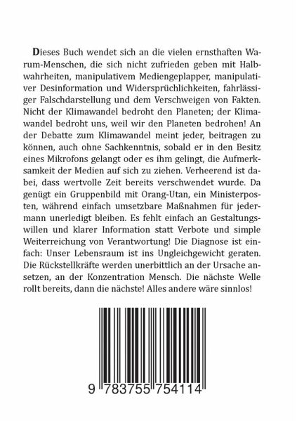 Seit etwa fünfzig Jahren führen wir eine Diskussion über den Klimawandel und dessen Folgen, - halbherzig und damit ohne Resultate. Das vorliegende Buch soll einen leicht verständlichen Beitrag zur aktuellen Klimadiskussion, deren Folgen und warum wesentliche Fakten verschwiegen werden, liefern. Mächtige Lobbyisten haben maßgeblich daran mitgewirkt, damit gesicherte Erkenntnisse nicht umgesetzt werden, auch deutsche Politiker und Parteien. Einfach zu verstehende Naturgesetze stellen die Zusammenhänge der zahlreichen Einflussgrößen her. Wertvolle Zeit wurde wider besseren Wissens verschwendet. Die Diagnose ist einfach: Unser Lebensraum ist ins Ungleichgewicht geraten. Die Rückstellkräfte werden unerbittlich an der Ursache ansetzen, an der Konzentration Mensch. Nicht der Klimawandel bedroht den Planeten; der Klimawandel bedroht uns, weil wir den Planeten bedrohen! Die nächste Welle rollt bereits an, dann die nächste! Alles andere wäre sinnlos! Neuartige Lösungskonzepte werden vorgeschlagen und diskutiert.