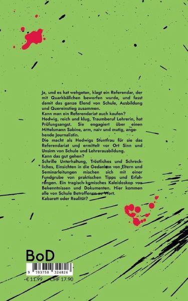 Ja, und es hat wehgetan, klagt ein Referendar, der mit Quarkbällchen beworfen wurde und fasst so das ganze Elend von Schule, Ausbildung und Quereinstieg zusammen. Kann man ein Referendariat auch kaufen? Hedwig, reich und klug, Traumberuf Lehrerin, hat Prüfungsangst. Sie engagiert über einen Mittelsmann Sabine, arm, naiv und mutig, angehende Journalistin.Die macht als Hedwigs Stuntfrau für sie das Referendariat und ermittelt vor Ort Sinn und Unsinn von Schule und Lehrerausbildung.Kann das gut gehen? Erfahrungen und praktische Tipps für die Bewältigung des Referendariats, schrille Unterhaltung, Schreckliches und Tröstliches mischen sich zu einem tragisch-komischen Kaleidoskop von Bekenntnissen und Dokumenten eines Lehramtsschwindels. Kabarett oder Realität? Hier kommen alle zu Wort - auch die, für die Schule eigentlich gemacht wird.