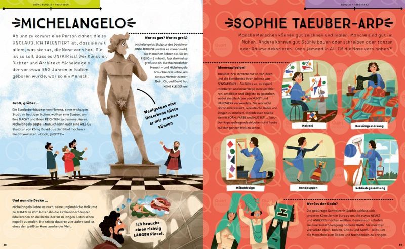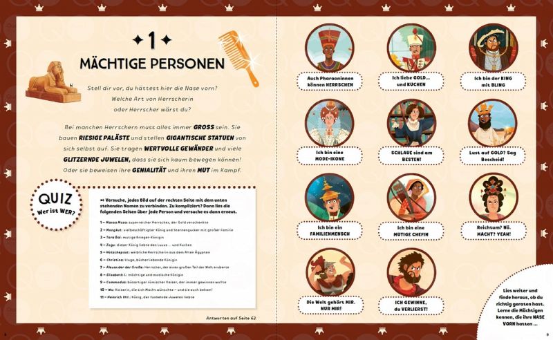 Du kannst auf verschiedene Weise durch dieses Buch reisen! Wenn du magst, kannst du das Buch einfach am Anfang beginnen. Oder du springst zu dem Abschnitt mit den Menschen, die du am interessantesten findest - Herrscher, Wissenschaftlerinnen und Kunstschaffende. Oder du hältst Ausschau nach den farbigen Reitern am oberen Seitenrand und siehst dir an, was die Menschen aus den einzelnen Epochen der Geschichte anstellten, um die Nase vorn zu haben.