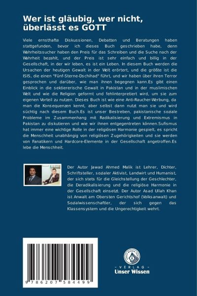 Viele ernsthafte Diskussionen, Debatten und Beratungen haben stattgefunden, bevor ich dieses Buch geschrieben habe, denn Wahrheitssucher haben den Preis für das Schreiben und die Suche nach der Wahrheit bezahlt, und der Preis ist sehr einfach und billig in der Gesellschaft, in der wir leben, es ist ein Leben. In diesem Buch werden die Ursachen der heutigen Gewalt in der Welt erörtert, und die größte ist die ISIS, die einen "Fünf-Sterne-Dschihad" führt, und wir haben über ihren Terror gesprochen und darüber, wie man ihnen begegnen kann.Es gibt einen Einblick in die sektiererische Gewalt in Pakistan und in der muslimischen Welt und wie die Religion geformt und fehlinterpretiert wird, um sie zum eigenen Vorteil zu nutzen. Dieses Buch ist wie eine Anti-Raucher-Werbung, da man die Konsequenzen kennt, aber selbst dann nutzt man sie und wird süchtig nach diesem Buch.Es ist unser Bestreben, pakistanische soziale Probleme im Zusammenhang mit Radikalisierung und Extremismus in Pakistan zu diskutieren und wie wir ihnen entgegentreten können.Sufismus hat immer eine wichtige Rolle in der religiösen Harmonie gespielt, es spricht die Menschheit unabhängig von religiösen Zugehörigkeiten und sie werden von Fanatikern und Hardcore-Elemente in der Gesellschaft angetroffen.Es lebe die Menschheit.
