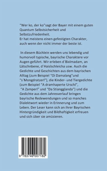 In meinem Buch "Wer ko, der ko" sind hauptsächlich Gedichte in oberbayrischer Mundart, aber auch einige Mundarterzählungen enthalten. Im ersten Kapitel "Typische Bayern" werden humorvoll und anschaulich charakteristische Bayern vor Augen geführt. Der Leser erlebt D' Bixlmadam, an Lätschnbene, d' Ratschkathl usw. Auch die Gedichte und Geschichten vom bayrischen Alltag (Oi Damalang, s' Mongdratzerl ...) die Kinder- und Tiergedichte (zum Beispiel A dramhaperte Urschl, A Zamperl) und die Gedichte aus dem Jahresverlauf bringen bayrische Redewendungen und so manches Dialektwort in Erinnerung und zum Leben. Der Leser kann sich an ihrer bayrischen Hintergründigkeit und Bildhaftigkeit erfreuen und sich über sie amüsieren.