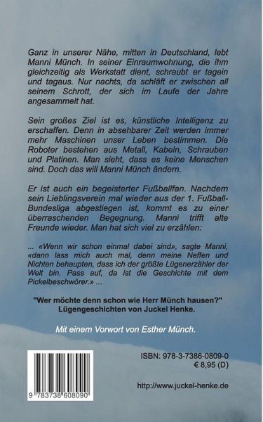 Ganz in unserer Nähe, mitten in Deutschland, lebt Manni Münch. In seiner Einraumwohnung, die ihm gleichzeitig als Werkstatt dient, schraubt er tagein und tagaus. Nur nachts, da schläft er zwischen all seinem Schrott, der sich im Laufe der Jahre angesammelt hat.Sein großes Ziel ist es, künstliche Intelligenz zu erschaffen. Denn in absehbarer Zeit werden immer mehr Maschinen unser Leben bestimmen. Die Roboter bestehen aus Metall, Kabeln, Schrauben und Platinen. Man kann sie also noch vom Menschen unterscheiden. Doch das will Manni Münch ändern. Nachdem sein Lieblingsverein mal wieder aus der 1. Fußball-Bundesliga abgestiegen ist, kommt es zu einer überraschenden Begegnung. Manni trifft alte Freunde wieder. Man hat sich viel zu erzählen.... «Wenn wir schon einmal dabei sind», sagte Manni, «dann lass mich auch mal erzählen, denn meine Neffen und Nichten behaupten, dass ich der größte Lügenerzähler vonne ganze Welt bin. Pass auf, da ist die Geschichte mit dem Pickelbeschwörer.» ..."Wer möchte denn schon wie Herr Münch hausen?"Lügengeschichten von Juckel Henke.