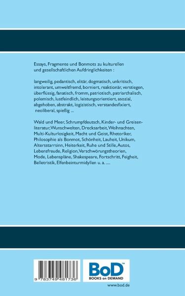 Essays, Fragmente und Bonmots zu kulturellen und gesellschaftlichen Aufdringlichkeiten :langweilig, pedantisch, elitär, dogmatisch, unkritisch,intolerant, umweltfremd, borniert, reaktionär, verstiegen,überflüssig, fanatisch, fromm, patriotisch, patriarchalisch,polemisch, lustfeindlich, leistungsorientiert, asozial, abgehoben,abtrakt, logizistisch, verstandesfixiert, neoliberal, spießig ... I N H A L T Lob der Lauheit Neues von hier und dir und mir Phänomenologie des Geistreichen Im Land der uneleganten Waldschrate 'Leichte Sprache' Jugend- und Alterslektüren Kein Gedanke ist der Vater eines Wunsches Von Arkadien zum Bücherparadies Apropos idyllische Elfenbeintürme Drecksarbeiter aller Länder, zerstreut euch! Das Behagen in der Unkultiviertheit Hochdekoriertes Christkindl? Politik oder Kultur? Urheberrechtsschutz für jeden Dreck? Magisches oder rationales Denken? Aphorismen sind Einfälle der Philosophen Philosophische Rhetorik Ä s t h e t i k Lob des Altersstarrsinns Das Unikum und seine Unikate 'Heiterkeit, güldene, komm!' (Nietzsche) Nun sei doch mal still ruht der See! Heimtier oder Tierheim? Die Zukunft des Autos ist seine Vergangenheit Was gibt und nimmt uns die schöne Literatur? ' C a r p e d i e m ' Der Ewige und Sein Urprojekt Verschwörungstheorien über Verschwörungstheorien? Gastbeiträge von Fritz H. Lotterfuchs Was ist morgen en vogue? Blütenträume und Lebensplanwirtschaft Willy Schüttelspeer Wozu Fortschritt? Von Mönchen, Memmen und alten Menschen Gestrandet im Meer Sekundärliteratur zum Aphorismus.