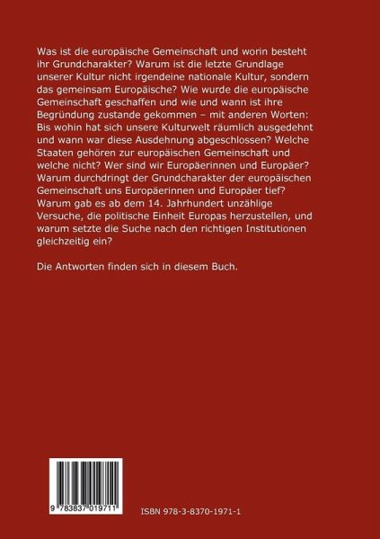 Was ist die europäische Gemeinschaft und worin besteht ihr Grundcharakter? Warum ist die letzte Grundlage unserer Kultur nicht irgendeine nationale Kultur, sondern das gemeinsam Europäische? Wie wurde die europäische Gemeinschaft geschaffen und wie und wann ist ihre Begründung zustande gekommen - mit anderen Worten: Bis wohin hat sich unsere Kulturwelt räumlich ausgedehnt und wann war diese Ausdehnung abgeschlossen? Welche Staaten gehören zur europäischen Gemeinschaft und welche nicht? Wer sind wir Europäerinnen und Europäer? Warum durchdringt der Grundcharakter der europäischen Gemeinschaft uns Europäerinnen und Europäer tief? Warum gab es ab dem 14. Jahrhundert unzählige Versuche, die politische Einheit Europas herzustellen, und warum setzte die Suche nach den richtigen Institutionen gleichzeitig ein? Die Antworten finden sich in diesem Buch.