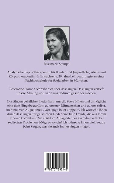 Rosemarie Stampa schreibt hier über das Singen. Das Singen vertieft unsere Atmung und kann uns dadurch gesünder machen. Das Singen geistlicher Lieder kann uns die Seele öffnen und ermöglicht eine tiefe Hingabe zu Gott, zu unseren Mitmenschen und zu uns selbst, im Sinne von Augustinus: 'Wer singt, betet doppelt'. Ich wünsche ihnen durch das Singen der geistlichen Lieder eine tiefe Freude, die aus ihrem Inneren kommt und Sie stärkt im Alltag oder bei Krankheit oder bei seelischen Problemen. Möge es so sein! Ich wünsche ihnen viel Freude beim Singen, was sie auch immer singen mögen.
