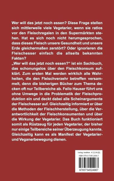 Wer will das jetzt noch essen? Diese Frage stellen sich mittlerweile viele Vegetarier, wenn sie ratlos vor den Fleischregalen in den Supermärkten stehen. Hat es sich noch nicht herumgesprochen, dass dieses Fleisch unsere Gesundheit und unsere Erde gleichermaßen zerstört? Oder ignorieren die Fleischesser einfach die allseits bekannten Fakten? "Wer will das jetzt noch essen?" ist ein Sachbuch, das schonungslos über den Fleischkonsum aufklärt. Zum ersten Mal werden wirklich alle Wahrheiten, die den Fleischverzehr betreffen versammelt, denn die bisherigen Bücher zum Thema decken oft nur Teilbereiche ab. Feilo Hauser führt uns ohne Umwege in die Problematik der Fleischproduktion ein und deckt dabei alle Scheinargumente der Fleischesser auf. Gleichzeitig informiert er über die Methoden der Fleischherstellung, über die Verantwortlichkeit der Fleischkonsumenten und über die Wirkung der Vegetarier. Das Buch funktioniert somit als Rüstzeug für jeden Vegetarier, der bisher nur einige Teilbereiche seiner Überzeugung kannte. Gleichzeitig kann es als Manifest der Vegetarier- und Veganerbewegung dienen.