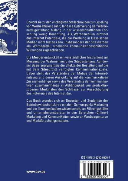 Uta Meeder entwickelt ein verständliches Instrument zur Messung der Wahrnehmung der Sitegestaltung. Auf dieser Basis analysiert sie die Effekte der Gestaltung auf die mit dem Siteauftritt verfolgten Kommunikationsziele. Dabei stellt das Verständnis der Motive der Internetnutzung und deren Auswirkung auf die kommunikativen Zusammenhänge sowie das Verständnis der kommunikativen Zusammenhänge in Abhängigkeit von produktbezogenen Merkmalen den Schlüssel zur Ausschöpfung des Potenzials des Internet dar.