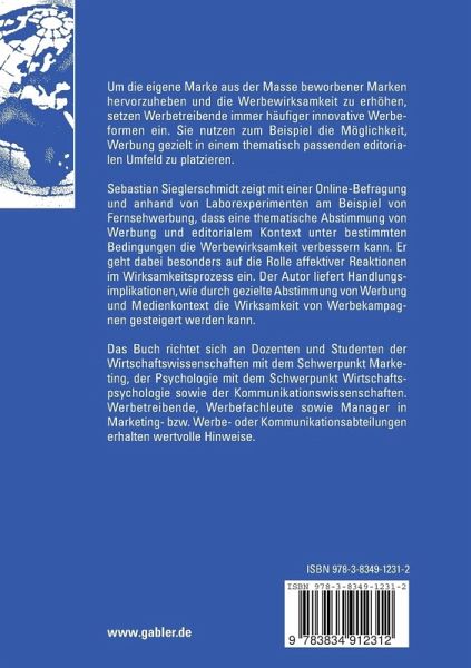 Sebastian Sieglerschmidt zeigt mit einer Online-Befragung und anhand von Laborexperimenten am Beispiel von Fernsehwerbung, dass eine thematische Abstimmung von Werbung und editorialem Kontext unter bestimmten Bedingungen die Werbewirksamkeit verbessern kann. Er geht dabei besonders auf die Rolle affektiver Reaktionen im Wirksamkeitsprozess ein. Der Autor liefert Handlungsimplikationen, wie durch gezielte Abstimmung von Werbung und Medienkontext die Wirksamkeit von Werbekampagnen gesteigert werden kann.