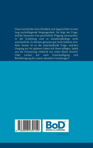 Diese Geschichte einer Kindheit und Jugend führt in eine lang zurückliegende Vergangenheit. Sie folgt der Frage, welche Szenarien eine persönliche Prägung verursachen. In der Erzählung sind es situationsbedingt recht anschauliche. Es können genauso gut recht farblose sein. Aber immer ist es die entscheidende Frage, welchen Umgang wir im späteren Leben mit ihnen pflegen. Spielt uns die Erinnerung vielleicht nur einen bösen Streich? Oder suchen wir nach Entschuldigung und Rechtfertigung für unsere aktuellen Handlungen?