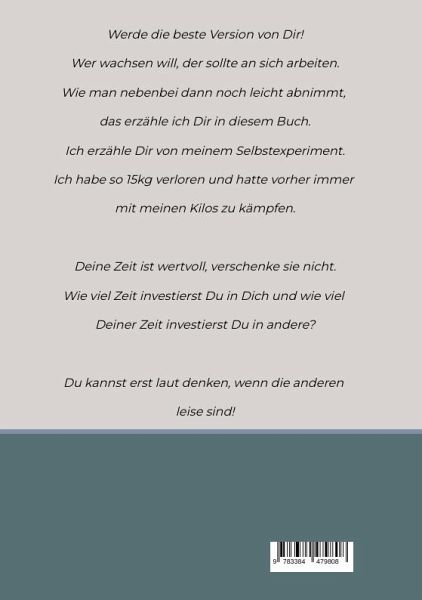 Um Abnehmen und Bewusstseinsarbeit.Jeder hat die Möglichkeit über sich hinaus zu wachsen. Jeder sollte an sich arbeiten. Das Leben ist wie eine Schule und alle Lebenssituationen sind da, um daraus zu lerne. Arbeite jeden Tag an Dir. Es geht darum wie Du die Dinge betrachtest und besser in die Selbstwahrnehmung kommst. In der Selbstwahrnehmung wirst Du automatisch abnehmen