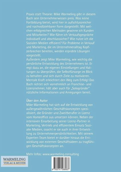 Unternehmerwissen für zukünftige MillionärePraxis statt Theorie: Mike Warmeling gibt in diesem Buch sein Unternehmerwissen preis. Was keine Fortbildung bietet, wird hier in aufschlussreicher und nachvollziehbarer Form dargestellt: Mit welchen erfolgreichen Methoden gewinne ich Kunden und Mitarbeiter? Wie führe ich Verkaufsgespräche individuell und abschlusssicher? Wie nutze ich die Sozialen Medien effizient? Für Probleme in Verkauf und Marketing, die im Unternehmeralltag Kopfzerbrechen bereiten, werden erprobte Lösungen vorgestellt.Außerdem zeigt Mike Warmeling, wie wichtig die persönliche Entwicklung des Unternehmers ist. Er regt dazu an, die eigenen Einstellungen und Haltungen zu überprüfen, die Selbstfürsorge im Blick zu behalten und sich durch Ziele zu motivieren. Mentale Kraft erleichtert den Weg zum Erfolg!Das Buch richtet sich vornehmlich an Franchise- und Lizenznehmer, hält aber auch für Sologründer nützliche Informationen und Anregungen bereit.