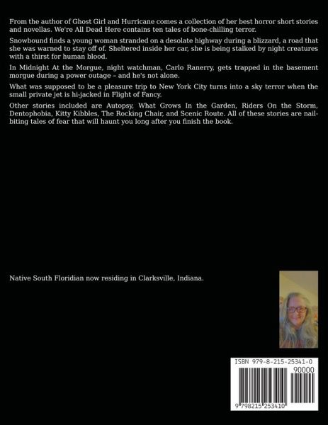 From the author of Ghost Girl and Hurricane comes a collection of her best horror short stories and novellas. We're All Dead Here contains ten tales of bone-chilling terror. Snowbound finds a young woman stranded on a desolate highway during a blizzard, a road that she was warned to stay off of. Sheltered inside her car, she is being stalked by night creatures with a thirst for human blood. In Midnight At the Morgue, night watchman, Carlo Ranerry, gets trapped in the basement morgue during a power outage – and he's not alone. What was supposed to be a pleasure trip to New York City turns into a sky terror when the small private jet is hi-jacked in Flight of Fancy. Other stories included are Autopsy, What Grows In the Garden, Riders On the Storm, Dentophobia, Kitty Kibbles, The Rocking Chair, and Scenic Route. All of these stories are nail-biting tales of fear that will haunt you long after you finish the book.