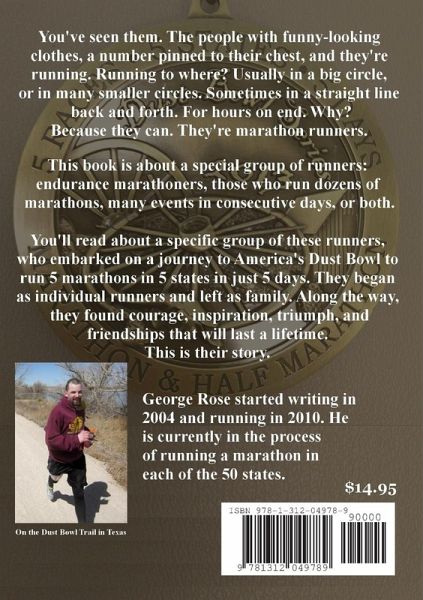 You've seen them. The people with funny-looking clothes, a number pinned to their chest, and they're running. Running to where? Usually in a big circle, or in many smaller circles. Sometimes in a straight line back and forth. For hours on end. Why? Because they can. They're marathon runners. This book is about a special group of runners: endurance marathoners, those who run dozens of marathons, many events on consecutive days, or both. You'll read about a specific group of these runners, who embarked on a journey to America's Dust Bowl to run 5 marathons in 5 states in just 5 days. They began as individual runners and left as family. Along the way, they found courage, inspiration, triumph, and friendships that will last a lifetime.