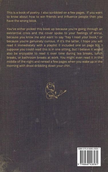 This is a book of poetry. I also scribbled on a few pages. If you want to know about how to win friends and influence people then you have the wrong book. You've either picked this book up because you're going through an existential crisis and the cover spoke to your feelings of ennui, because you know me and want to say "hey I read your book," or because you're genuinely curious. If it's the latter, I hope you will read it immediately with a playlist (I included one on page 93). I suppose you could read this is in one sitting, but I believe it would also be enjoyable to read it over time during tea breaks, lunch breaks, or bathroom breaks at work. You might even read it in the middle of the night and reread a few pages when you wake up in the morning with drool dribbling down your chin. My first book, Notes On a Hospitalized Pregnant Woman, is available on Amazon, Audible, and in a few indie bookstores around the country filled with book clerks wondering "what the hell is this still doing here?"