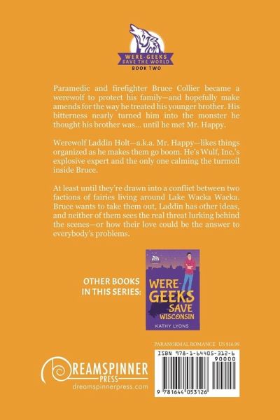 Paramedic and firefighter Bruce Collier became a werewolf to protect his family—and hopefully make amends for the way he treated his younger brother. His bitterness nearly turned him into the monster he thought his brother was… until he met Mr. Happy. Werewolf Laddin Holt—aka Mr. Happy—likes things organized as he makes them go boom. He’s Wulf, Inc’s explosive expert and the only one calming the turmoil inside Bruce. At least until they’re drawn into a conflict between two factions of fairies living around Lake Wacka Wacka. Bruce wants to take them out, Laddin has other ideas, and neither of them sees the real threat lurking behind the scenes—or how their love could be the answer to everybody’s problems.