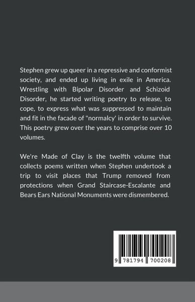 Stephen grew up queer in a repressive and conformist society, and ended up living in exile in America. Wrestling with Bipolar Disorder and Schizoid Disorder, he started writing poetry to release, to cope, to express what was suppressed to maintain and fit in the facade of "normalcy' in order to survive. This poetry grew over the years to comprise over 10 volumes. We're Made of Clay is the twelfth volume that collects poems written when Stephen undertook a trip to visit places that Trump removed from protections when Grand Staircase-Escalante and Bears Ears National Monuments were dismembered.