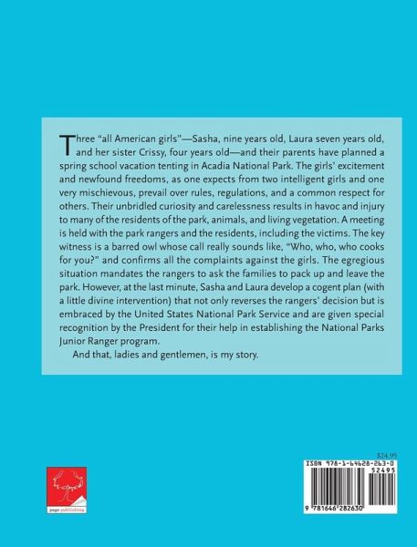 Three "all American girls"-Sasha, nine years old, Laura seven years old, and her sister Crissy, four years old-and their parents have planned a spring school vacation tenting in Acadia National Park. The girls' excitement and newfound freedoms, as one expects from two intelligent girls and one very mischievous, prevail over rules, regulations, and a common respect for others. Their unbridled curiosity and carelessness results in havoc and injury to many of the residents of the park, animals, and living vegetation. A meeting is held with the park rangers and the residents, including the victims. The key witness is a barred owl whose call really sounds like, "Who, who, who cooks for you?" and confirms all the complaints against the girls. The egregious situation mandates the rangers to ask the families to pack up and leave the park. However, at the last minute, Sasha and Laura develop a cogent plan (with a little divine intervention) that not only reverses the rangers' decision but is embraced by the United States National Park Service and are given special recognition by the President for their help in establishing the National Parks Junior Ranger program. And that, ladies and gentlemen, is my story.
