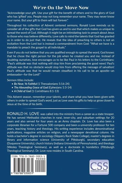 "Acknowledge your gift. Use your gift for the benefit of others and to the glory of God who has ‘gifted’ you. People may not long remember your name. They may never know your name. But your gift to them will last forever." Throughout his collection of Advent centered sermons, Ronald Love reminds us to consider all of the gifts that God has given us and to use that which makes us unique to spread the word of God. Although it might be an intimidating task to preach about Jesus to those who may believe differently, Love calls to mind the talents that God has granted us in order to do just that.…mehr
