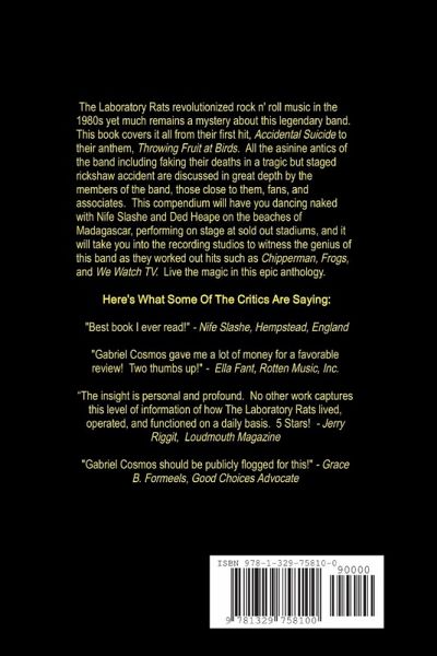 We're The Laboratory Rats is the ultimate compendium regarding one of rock music's most prolific and outrageous bands. Have a drink with them as they dance naked on the beaches of Madagascar, perform to sold out stadiums and fake their deaths in a rickshaw accident. Come inside the recording studios as they compose hits such as Chipperman, Frogs, We Watch TV and their anthem, Throwing Fruit at Birds.