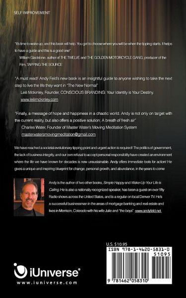 "It's time to wake up, and this book will help. You get to choose where you will be when the tipping starts. It helps to have a guide and this is a good one" William Gladstone, author of THE TWELVE and THE GOLDEN MOTORCYCLE GANG, producer of the Film, TAPPING THE SOURCE "A must read! Andy Feld's new book is an insightful guide to anyone wishing to take the next step to live the life they want in "The New Normal" Leili Mckinley, Founder, CONSCIOUS BRANDING: Your Identity is Your Destiny. www.leilimckinley.com "Finally, a message of hope and happiness in a chaotic world. Andy is not only on target with the current reality, but also offers a positive solution; A breath of fresh air" Charles Water, Founder of Master Water's Moving Meditation System masterwatersmovingmeditation@gmail.com We have reached a societal evolutionary tipping point and urgent action is required! The politics of government, the lack of business integrity, and our own refusal to accept personal responsibility have created an environment where the life we have known for decades is now unsustainable. Andy offers immediate tools for action! He gives a unique and inspiring blueprint for change, personal growth, and abundance, in the years to come