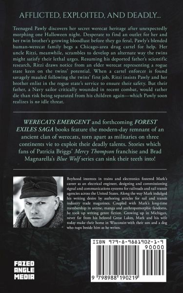 *** FIRST IN A COMPLETE SERIES! *** Afflicted, exploited, and deadly... Teenaged Pawly discovers her secret werecat heritage after unexpectedly morphing into a lynx one Halloween night. She and her twin brother thrill as they explore their newly revealed abilities, never far from the watchful eye of their blended human-werecat family. But the old folks know that unless they can find an outlet for the twins' growing bloodlust, they will both soon turn feral. Meanwhile, Pawly's uncle Ritzi scrambles to develop a means to sate her and her brother's lethal urges. Resuming his deported father's scientific research and desperate for funding, Ritzi draws notice from a nefarious rogue state eager to help-and to exploit the twins' lethal potential. As her family strives to keep the twins' blood rage in check, Pawly finds herself caught between a Chicago-area drug cartel and the rogue state wooing her uncle. While either could aid in reining in her inner beast, neither has her family's best interest at heart. Unless a solution can be found quickly, Pawly and her brother will both succumb to their feral natures. And this time, more than just the family pet will end up torn to shreds. Werecats Emergent and additional Forest Exiles Saga books feature the modern-day remnant of an ancient clan of werecats, torn apart as militaries on three continents vie to exploit their deadly talents. Stories which fans of Patricia Briggs' Mercy Thompson franchise and Brad Magnarella's Blue Wolf series can sink their teeth into!