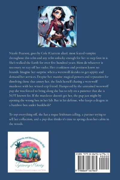 Nicole Pearson (current alias) most feared vampire throughout this realm and any realm unlucky enough for her to step foot in it. She's walked the Earth for over five hundred years. Most do whatever is necessary to stay off her radar. Her crankiness and pettiness know no bounds. Imagine her surprise when a werewolf decides to get uppity and demand her services. Despite her massive magical powers and reputation for dissolving those that annoy her, she finds herself chasing a werewolf murderer with her wizard cop friend. Hampered by the untrained werewolf pup she was forced to bring along she has to rely on a patience that she is NOT known for. If the murderer doesn't get her, the pup just might by opening the wrong box in her lab. But in his defense, who keeps a dragon in a bamboo box under bunkbeds? To top everything off, she has a rogue Irishman calling, a partner trying to sell her collection, and a pup that thinks it's time to spring clean her cabin in the woods.