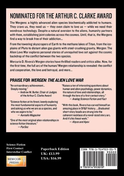 The Wergens: a highly sophisticated alien race biochemically infatuated with humans. They crave us, they need us, while we need their technology. Humanity does what it always does. We exploit them. Until, that is, the Wergens find a way to circumvent their addiction... From the towering skyscrapers of Earth to the methane lakes of Titan, from the ice-plains of Pluto to distant alien gas giants with steel-crushing gravity, Wergen: The Alien Love War explores personal stories of unrequited love set against the cosmic backdrop of the conflict between the two species. Mercurio D. Rivera's Wergen stories have wowed readers and critics alike. Now, for the first time, the full arc of the human/Wergen relations is revealed: the conflict, cooperation, love, betrayal, and more. "Mindblowing hard science fiction" - N.K. Jemisin, Hugo Award Winning Author "Rivera gradually introduces a surprising level of ambivalence and complexity. What initially seems benevolent becomes quite the opposite, before evolving again. There are twists followed by more twists, heightening a powerful sense of alienation and menace. The conceptual and ethical switchbacks... are dizzying." - Tor.com "Fascinating and satisfying... exploring the nature of love. Is love something deeply spiritual or simply the result of chemical reactions in the brain?" - The Fix "The mystery of love's origins and endings are universal for humans and aliens alike, something that transcends mere biochemistry." - Tangent Online "Rivera has shown great invention here and written something that will touch you deeply." - SF Revu