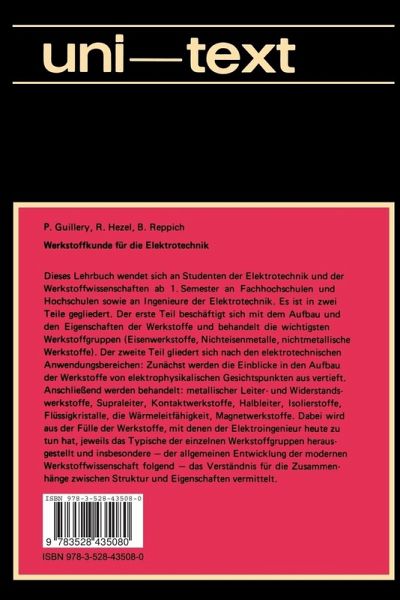 I. Grundlagen. Ausgewählte Kapitel aus der allgemeinen Werkstoffkunde.- 1 Aufbau kristalliner Werkstoffe.- 2 Diffusion und Umwandlung.- 3 Mechanische Eigenschaften.- 4 Eisenwerkstoffe.- 5 Nichteisenmetalle.- 6 Nichtmetallische Werkstoffe.- 7 Korrosion und Korrosionsschutz.- 8 Verbindungstechnik metallischer Werkstoffe.- 9 Untersuchungsmethoden und Prüfverfahren.- II. Die meist verwendeten Werkstoffgruppen der Elektrotechnik nach ihren Haupteigenschaften geordnet.- 10 Einleitende Übersicht über Zusammenhänge zwischen der Art der interatomaren Bindungen, den mechanischen Eigenschaften und der Elektrizitätsleitung bei festen Körpern.- 11 Der Halleffekt und seine Bedeutung zum Studium der Leitungsvorgänge in Metallen, Halbleitern und festen Ionenleitern.- 12 Metallische Leiter-und Widerstandswerkstoffe.- 13 Supraleiter.- 14 Kontaktwerkstoffe.- 15 Elektronische Halbleiter.- 16 Der Kohlenstoff und seine Verbindungen als Werkstoffe der Elektrotechnik ....- 17 Isolierstoffe.- 18 Flüssigkristalle.- 19 Die Wärmeleitfähigkeit gebräuchlicher Werkstoffe.- 20 Magnetische Werkstoffe.- Anhang: Normung.- Bildnachweis.- Literatur.- Sachwortverzeichnis.
